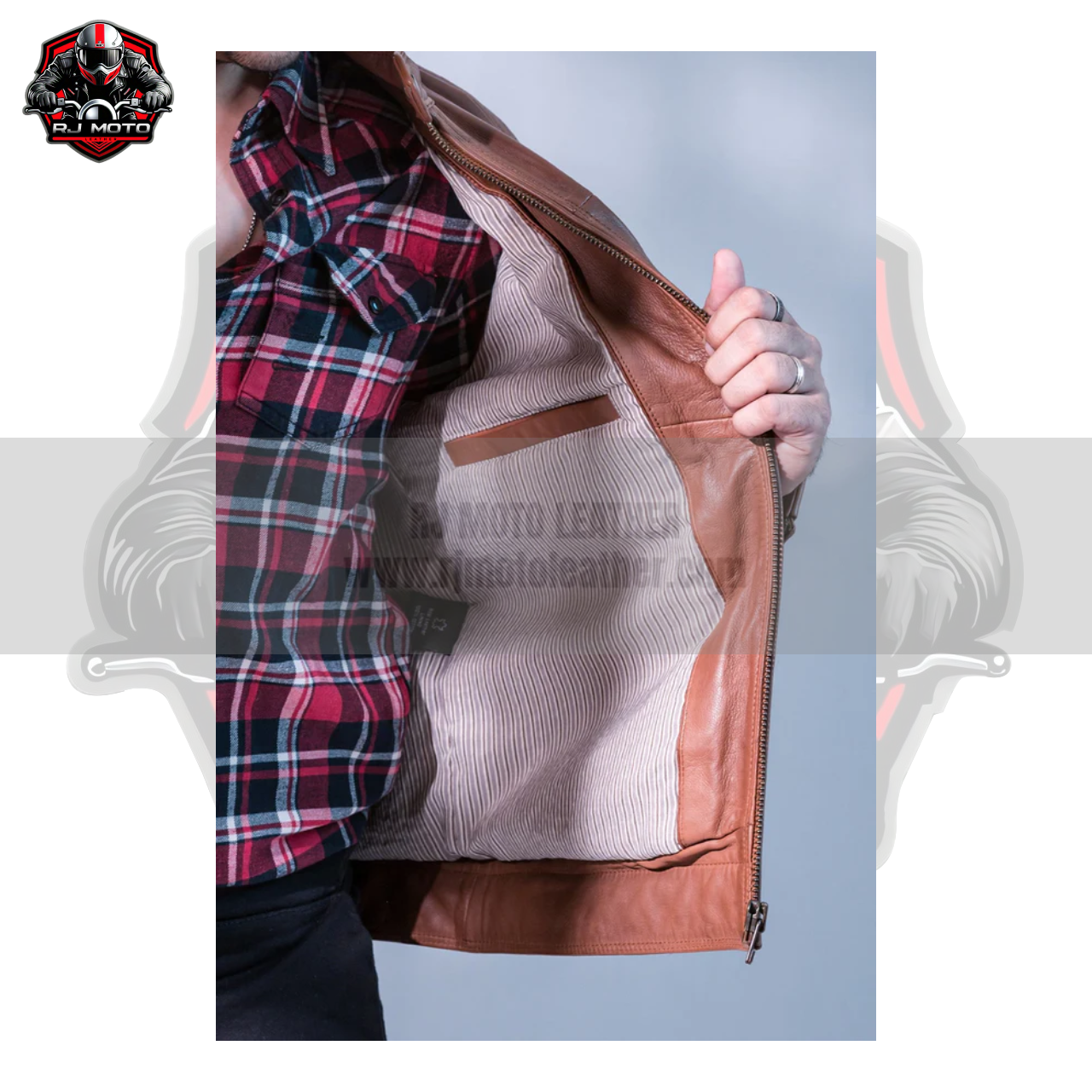Get the ultimate biker look with our Men’s Brown Café Racer Leather Jacket. Made from 100% genuine cowhide leather, this handcrafted vintage-style moto jacket is designed for comfort and durability. Featuring a slim-fit cut, multiple zippered pockets, a snap-tab collar, and soft inner lining, this is the perfect addition to any rider’s wardrobe. Whether you’re on the road or styling casually, this brown leather motorcycle jacket offers timeless appeal.