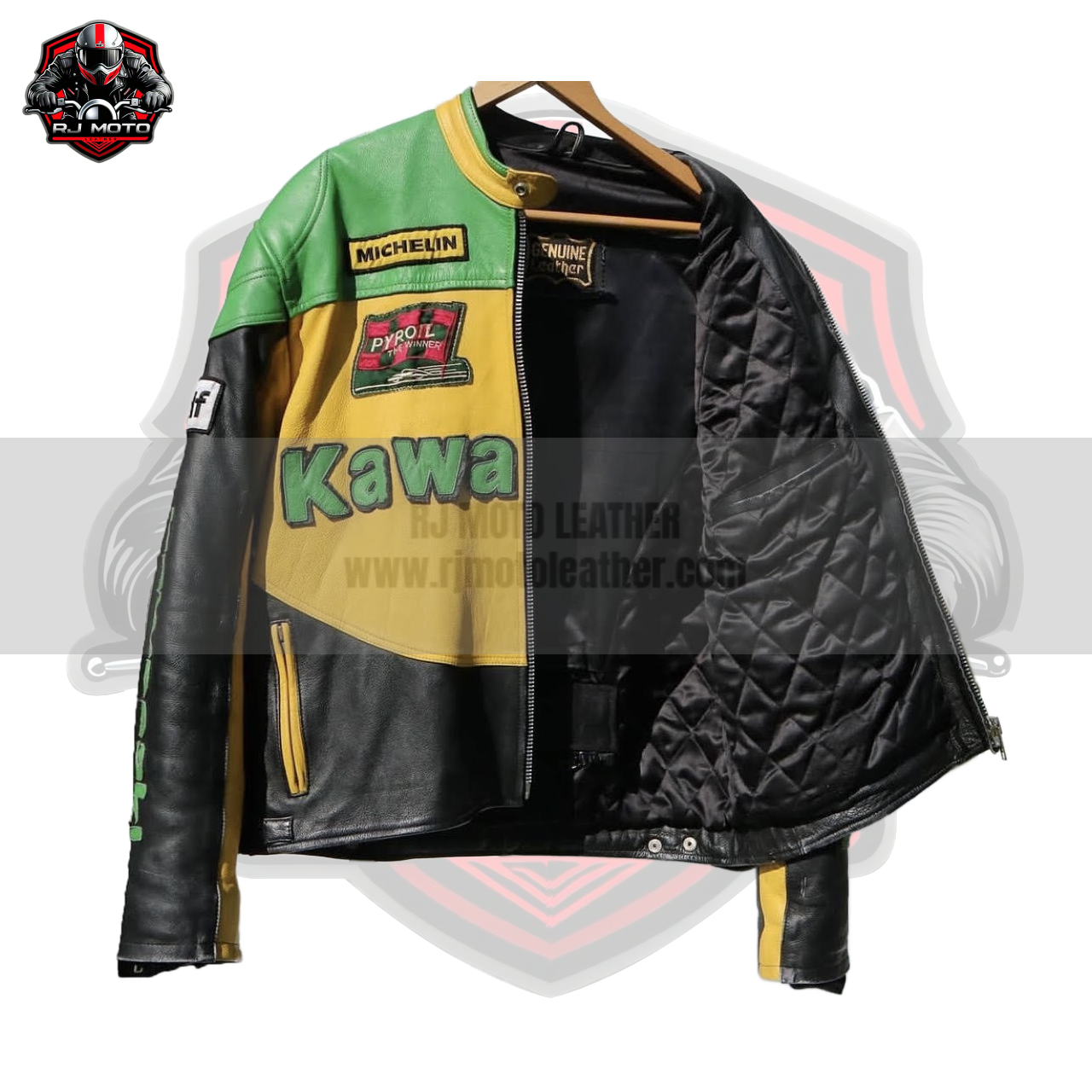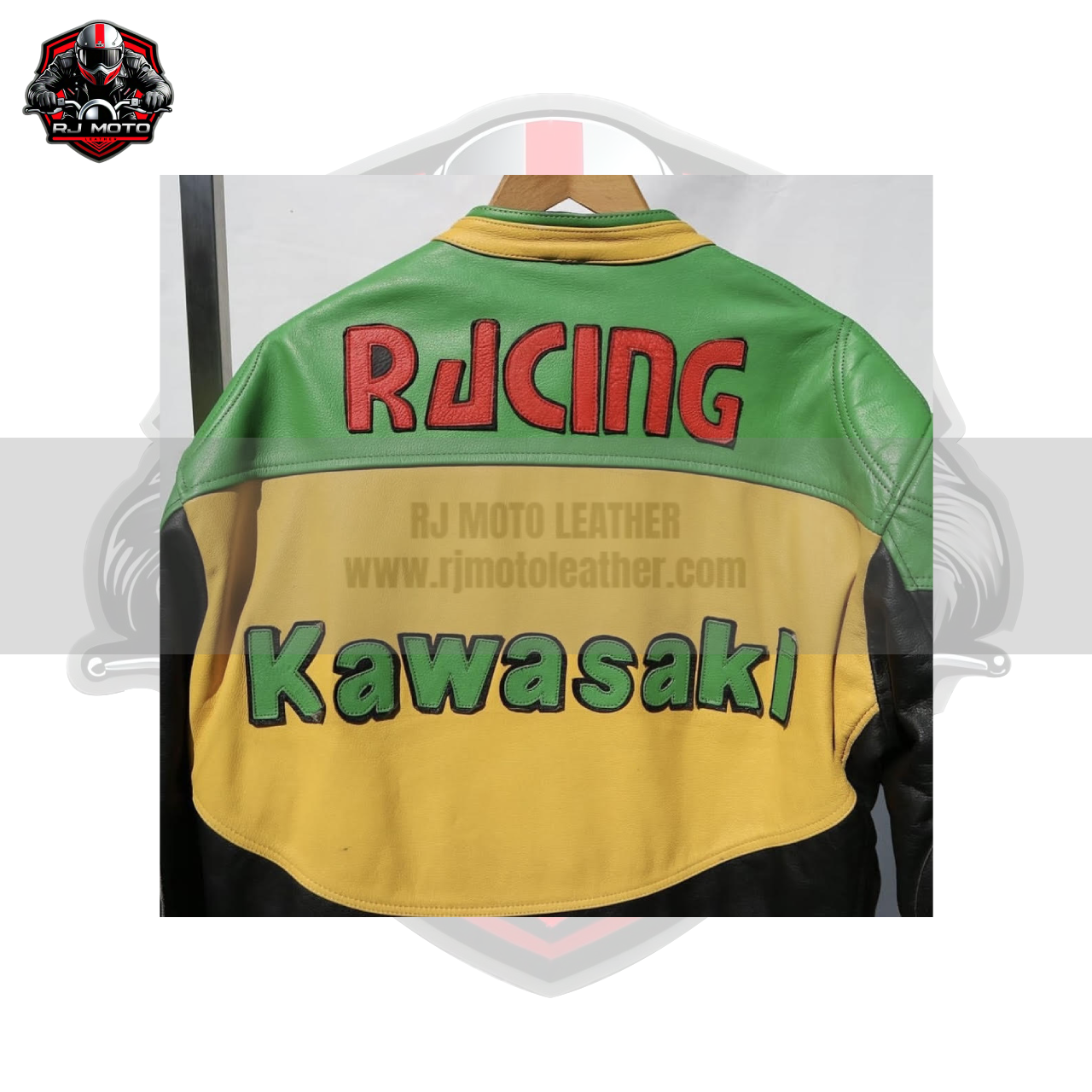 Upgrade your riding wardrobe with the Kawasaki Vintage Streetwear Motorbike Racing Leather Jacket, one of the boldest motorcycle jackets for men available today. Order now and ride confidently with RJ Moto Leather.